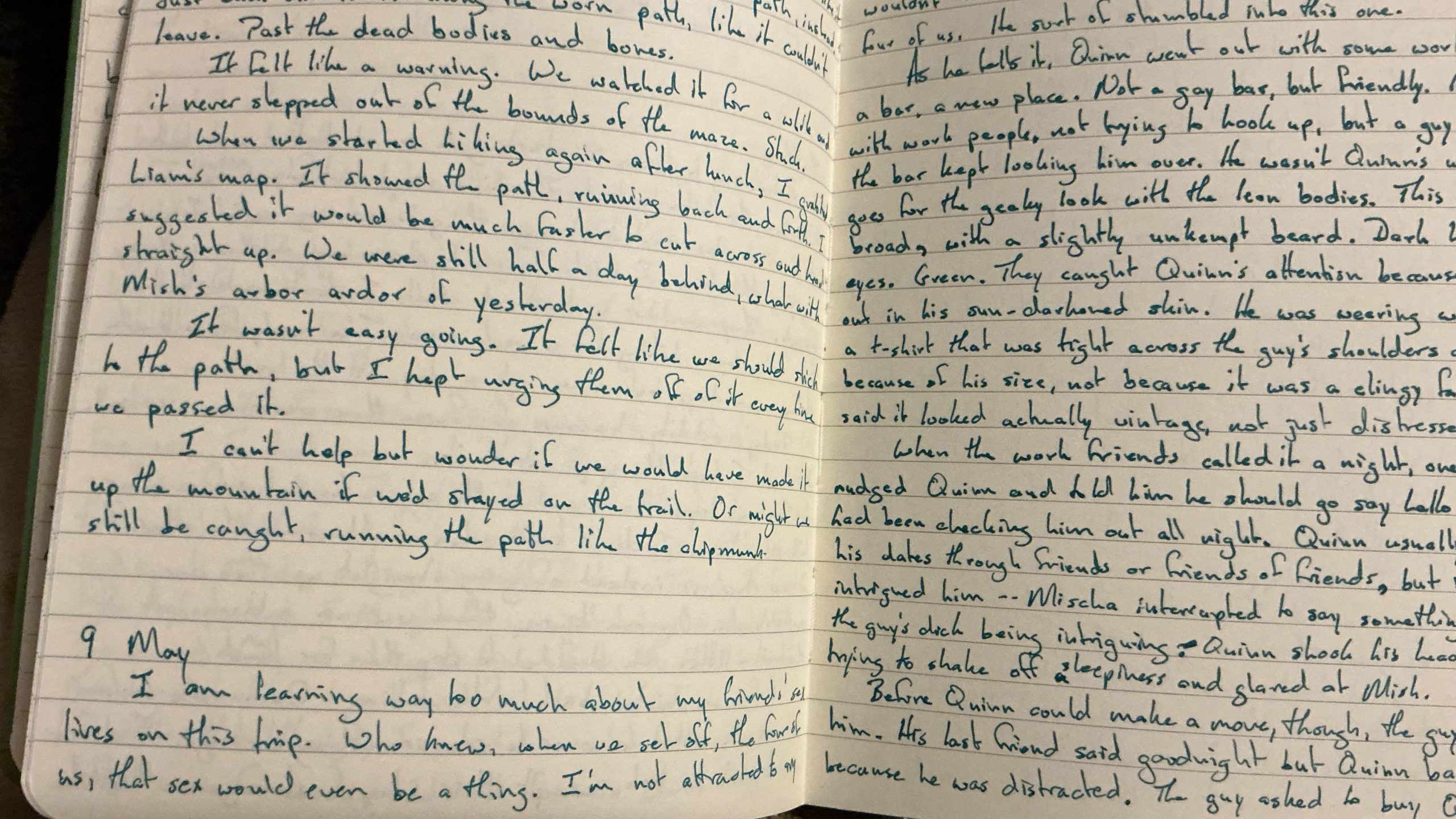 I am learning way too much about my friends’ sex lives on this trip. Who knew, when we set off, the four of us, that sex would even be a thing. I’m not attracted to any of these guys and I’m pretty sure the feeling is mutual. Again, Mish doesn’t discriminate, but even he, I think, would draw the line with one of us. Unless someone else was involved, anyway, from what Liam has told me.